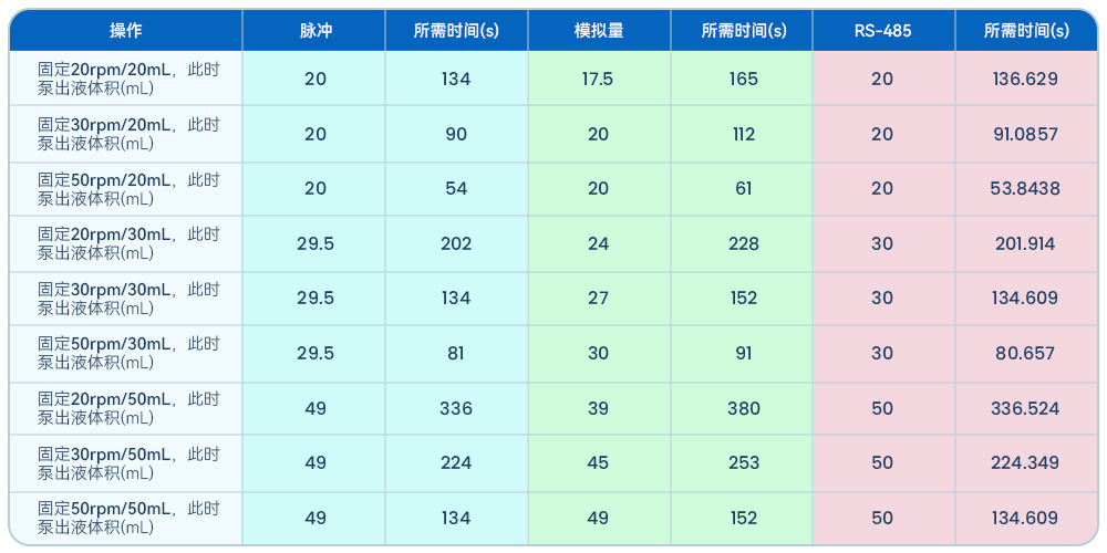 從表中數據可以看出,一旦改變了轉速和泵出量,不同的驅動方式控制的蠕動泵會有不同結果。3種驅動方式中,RS-485通訊方式的控制精度最優(yōu),脈沖次之,模擬量的誤差最大。