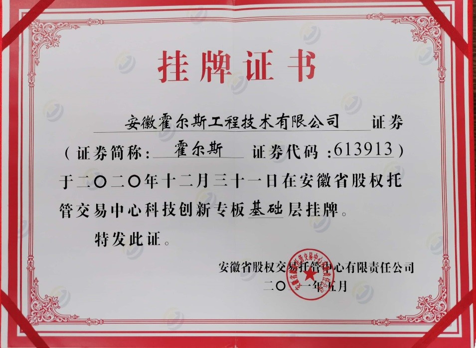 霍爾斯專注于生物工程領域的設備研發與制造,公司投入了大量的人力與資金,始終堅持自主創新,不僅在2020年取得高新技術企業認定,并在2020年底在安徽省股權托管交易中心科技創新專板成功掛牌。