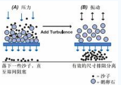 (A)對混合物施加直接的壓力,使得底部砂粒落下;在篩網表面形成一個鵝卵石層,阻礙頂部砂粒向篩網方向移動并通過篩網。(B)振動篩網,破壞位于混合物底部的積聚鵝卵石層,使完全分離得以進行;切向流過濾中,進科流的錯流動力學作用,就相當于此例中的振動。
