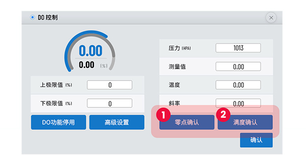 將電極接通電源后,先放入無(wú)氧環(huán)境中,待讀數(shù)穩(wěn)定后點(diǎn)擊“零點(diǎn)確認(rèn)”,再將電極放入純氧環(huán)境中,待讀數(shù)穩(wěn)定后點(diǎn)擊“滿度確認(rèn)”,彈出窗口“DO電極OK”即表示校準(zhǔn)完成。