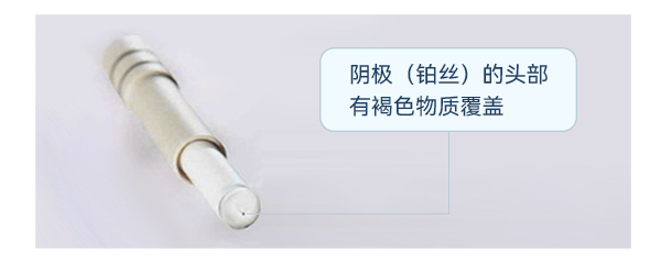 這種情況下,將內(nèi)電極的頭部對(duì)著光源觀察陰極,可以看到陰極表面顯露出黑色。可使用標(biāo)號(hào)1000目以上的砂紙?jiān)阢K絲頭部輕輕打磨數(shù)次,至鉑絲表面發(fā)亮即可。切不可過(guò)度打磨,否則會(huì)使內(nèi)電極頭部受損。